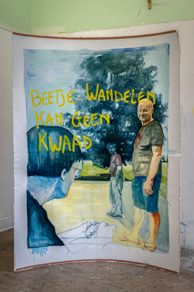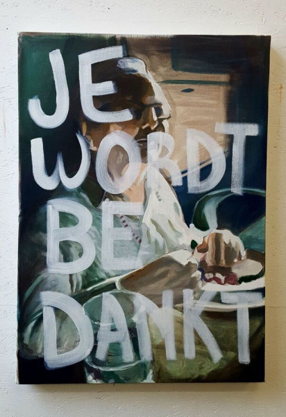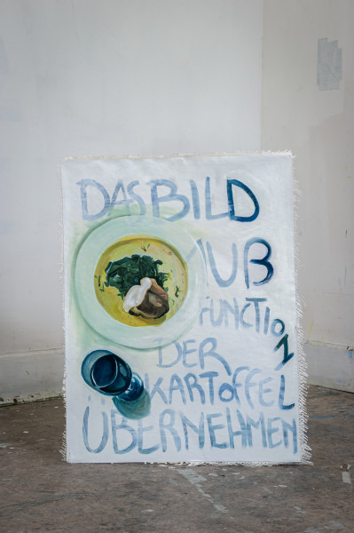 The art of Kristof Van Heeschvelde is a broad reflection about reality. Instead of being an escapist for who the art in itself is everything and the problems of reality are ignored, the paintings of Kristof Van Heeschvelde engage in a dialogue which is renewed on every canvas. This approach is the theme of Die Function der Kartoffel, the function of the potato. What other function does a potato have then to nourish people?