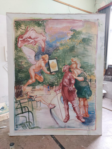 The answer of Kristof Van Heeschvelde is that the cultural image should replace the potato. Can we say with Kristof that art is more nourishing than physical food? It reminds of the ascetic saints of the past who would fast and focus their minds on God. Is Kristof Van Heeschvelde then a religious artist as he transcends the physical? The theme of religion is present in ‘Wijze mannen/Wise Men’(2020), where the adoration of the infant Christ by the three wise men is placed in a radical new context by the presence of an everyday mother. Is Kristof Van Heeschvelde a radical painter? He is radical to the extent that he uses a classical realist art for messages which are contemporary. He uses the technical quality of a master of the past combining often ironic and witty layers of meaning.